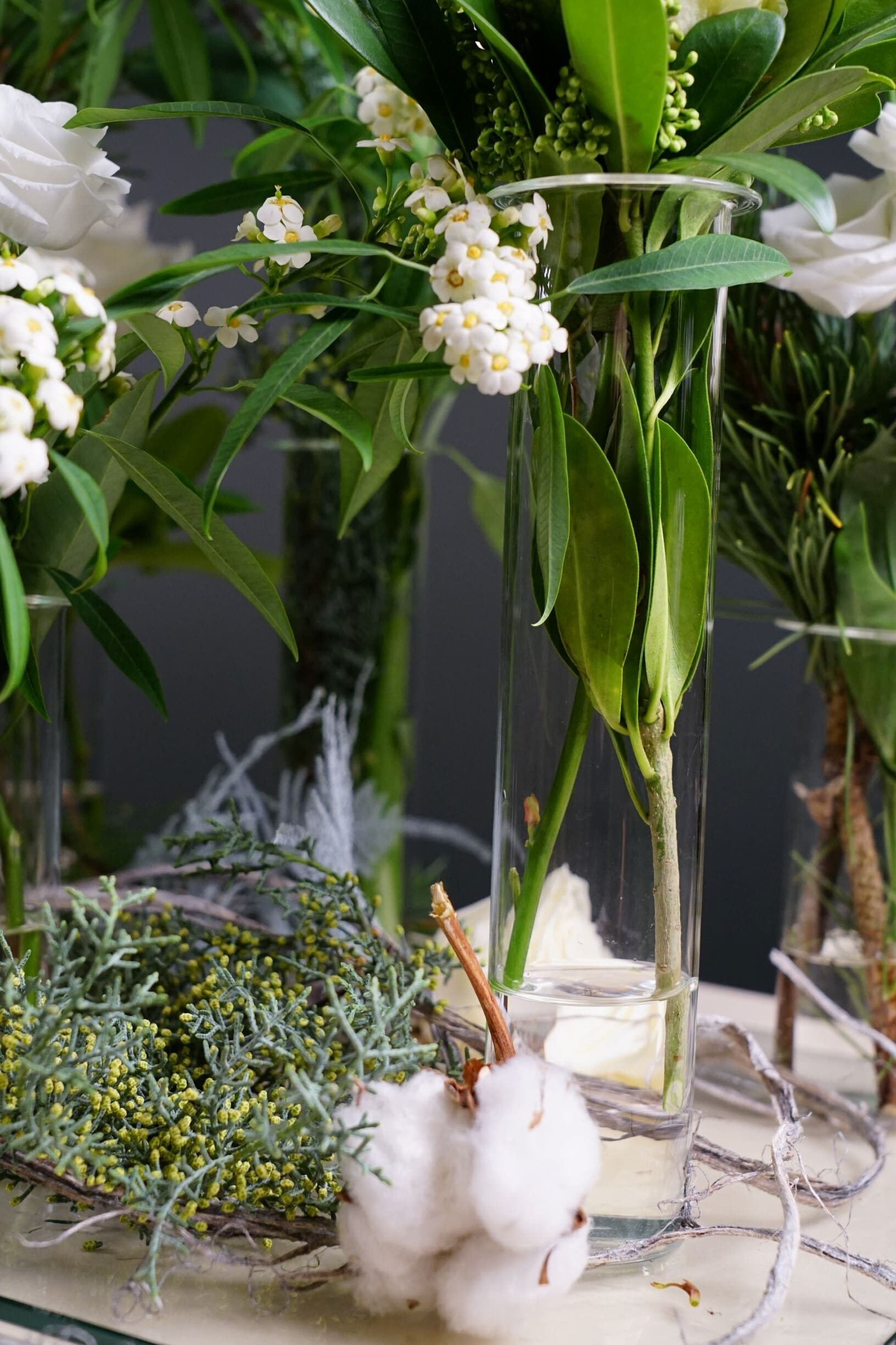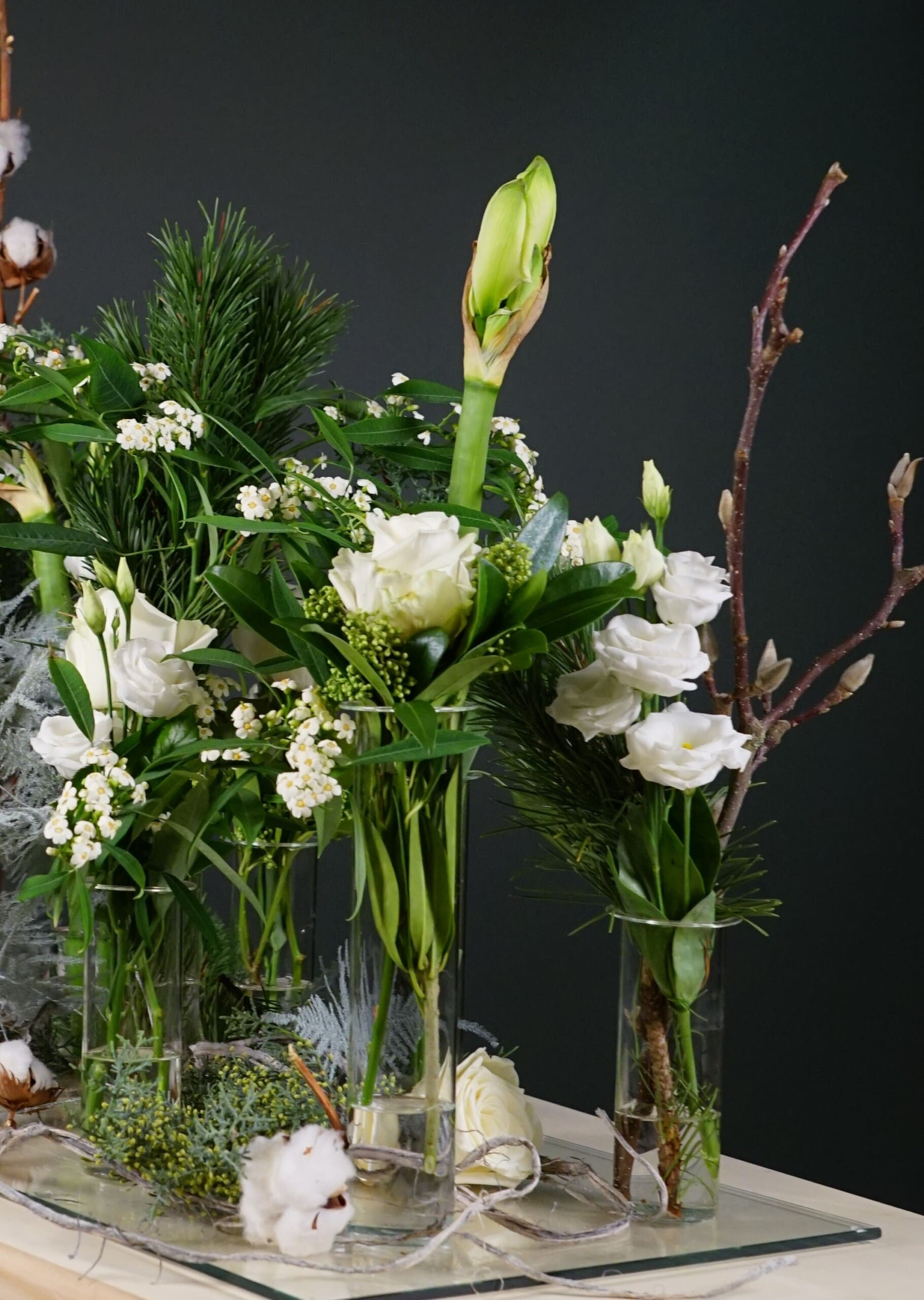 Het arrangement bestaat uit de “glazen-kistplaat-met-vaasjes”. Opvallend door de amaryllissen, opvallender door de glazen ondergrond, het opvallendst door de glazen (jawel, echt glas!) vaasjes die verlijmd zijn aan de ondergrond…