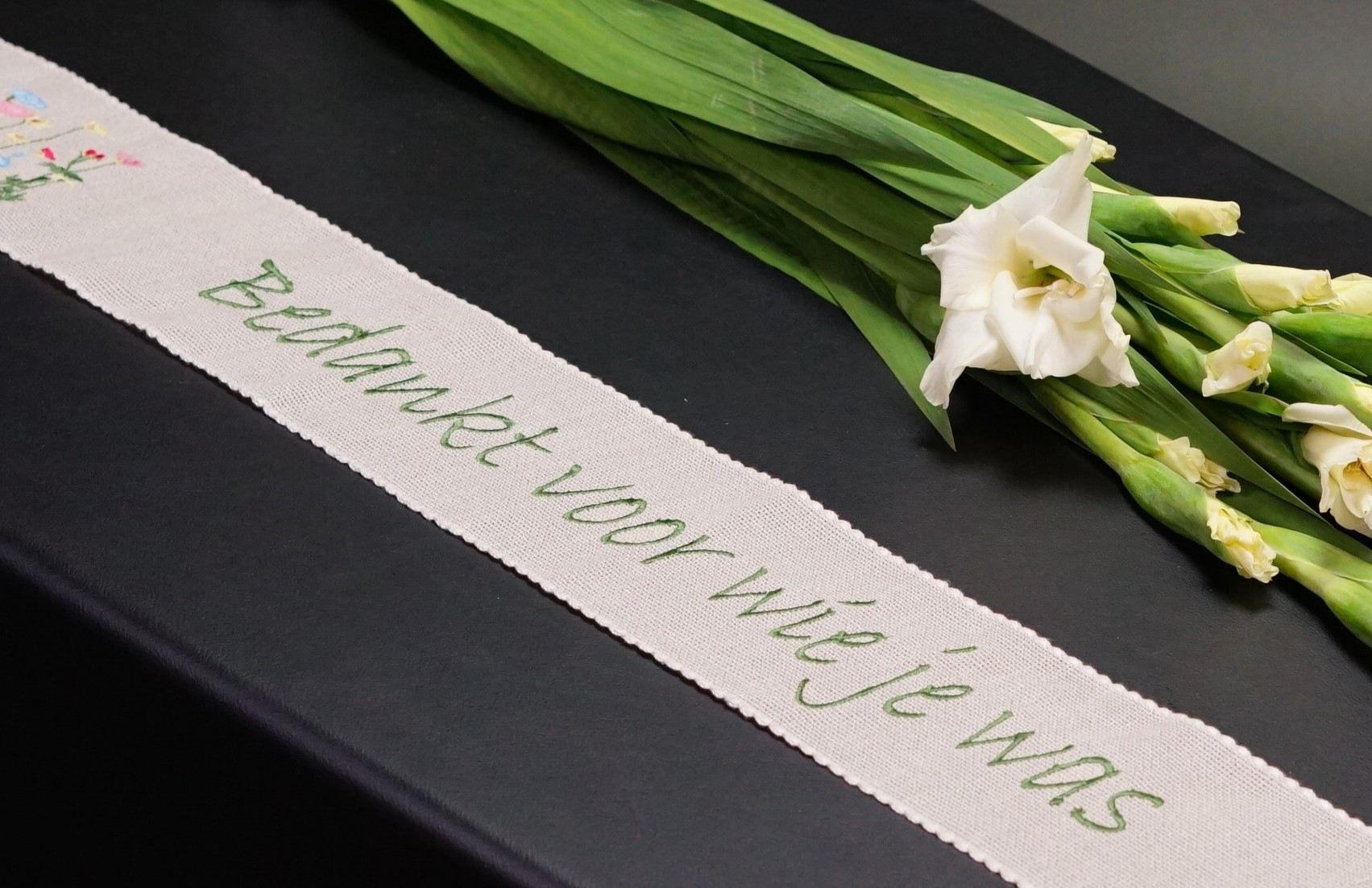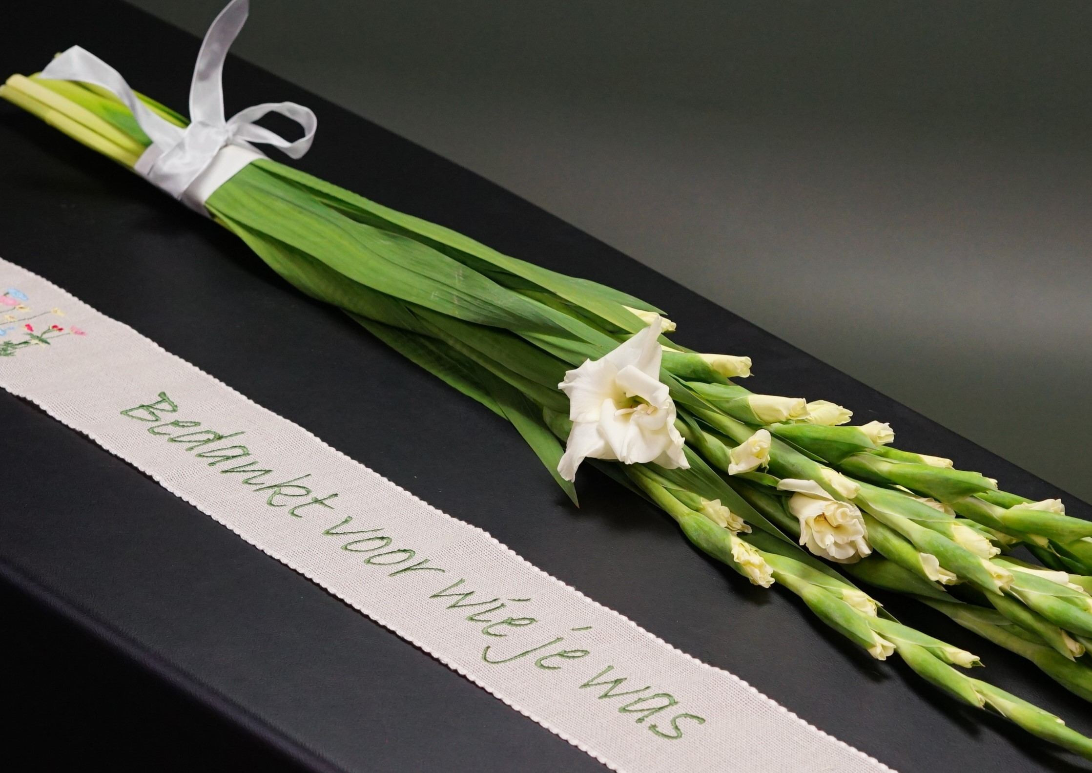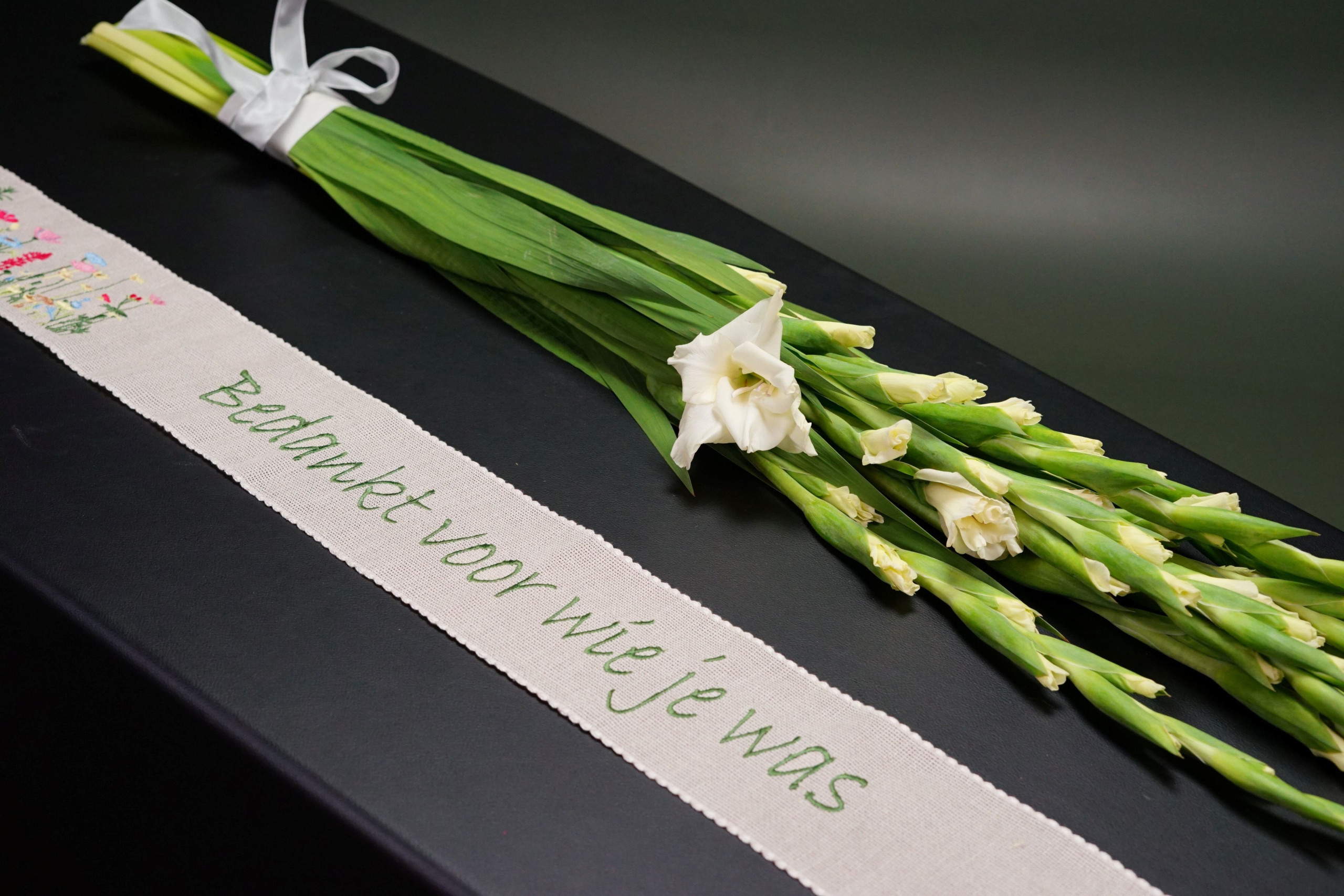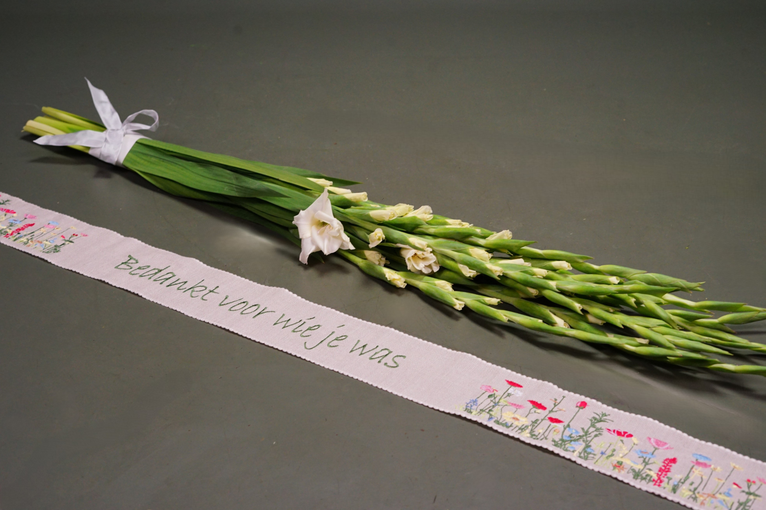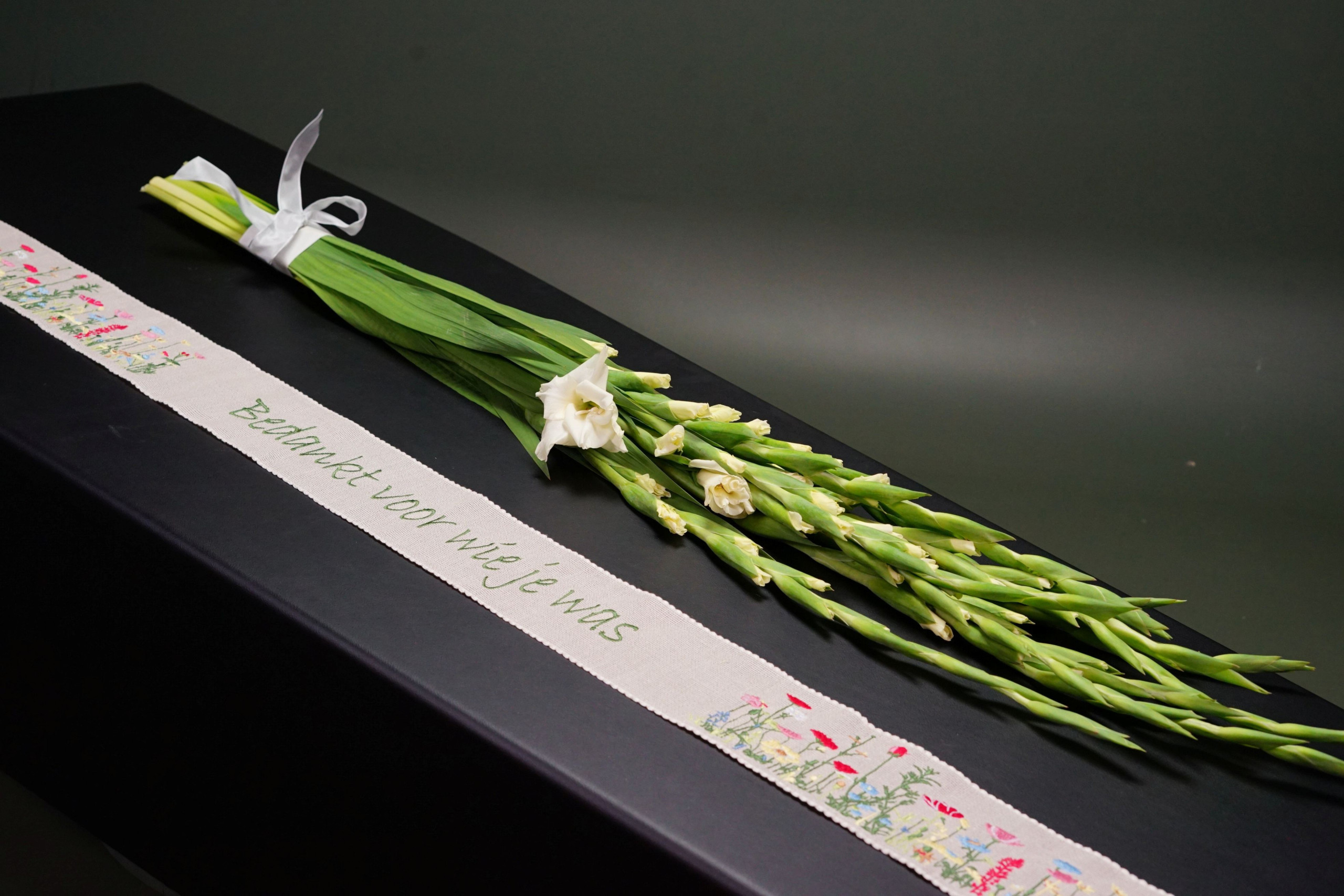 In dit voorbeeld is het arrangement uitgebreid met een chique geborduurd lint; wanneer dit u aanspreekt denken wij graag met u mee. (De prijs is exclusief het lint)